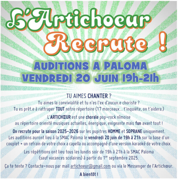 Une nouvelle chance de rejoindre un Artichoeur gros comme ça 💚! Pupitres Altis et Hommes, chanson au choix, a capella…